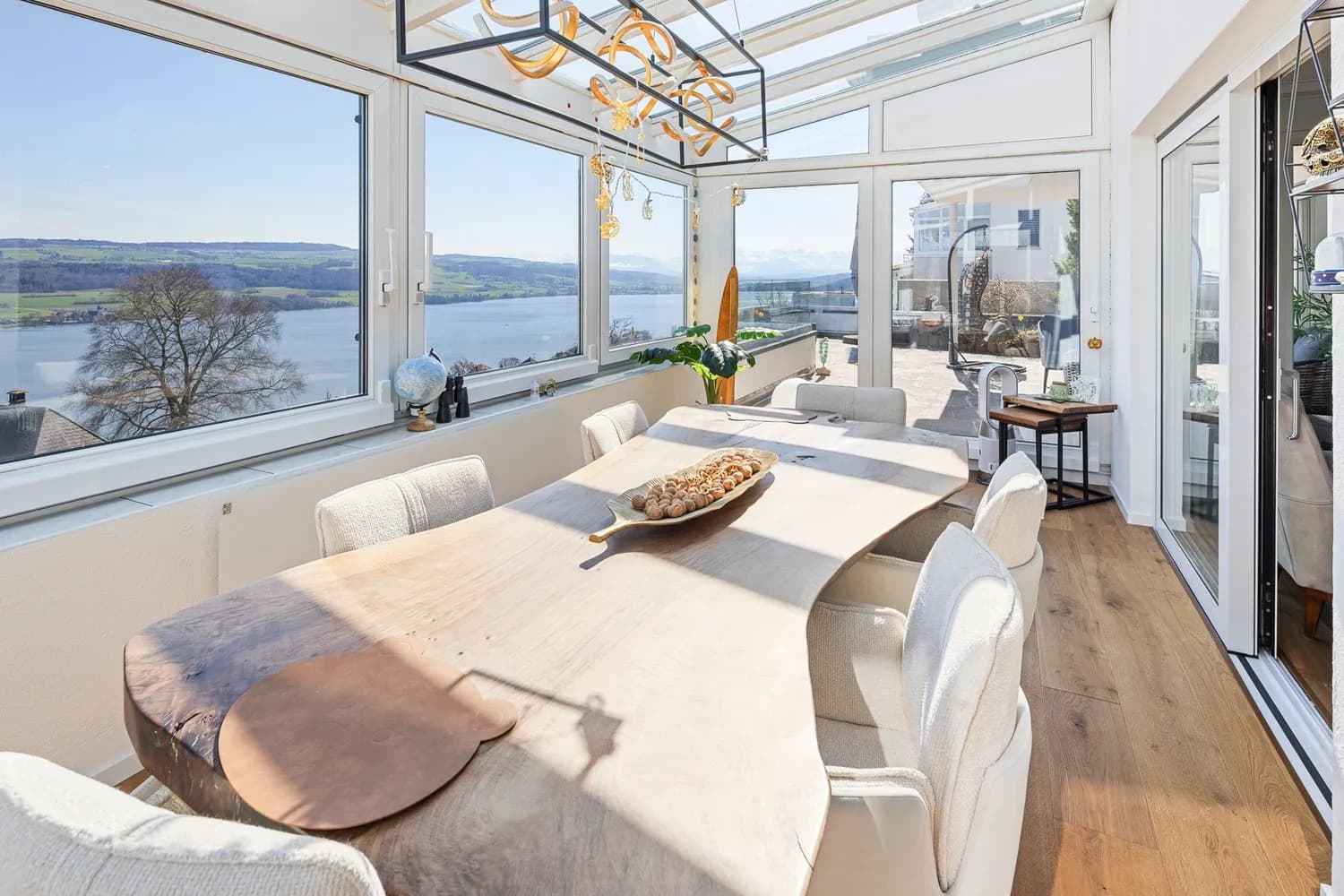 Diese Lage spricht für sich: Hier leben Sie in erhöhter Lage über dem Hallwilersee und geniessen eine traumhafte, unverbaubare Panaromasicht über den See bis hin in die Alpen. Diese gepflegte Wohnoase bietet Ihnen ein Wohngefühl, welches man nur selten findet. Sie wohnen zuoberst, profitieren von viel Privatsphäre und einer besonderen Ruhe. Zwei separate Wohnungszugänge sorgen für zusätzlichen Komfort. Über den unteren, gedeckten Zugang von der Garage gelangen Sie in ein Entrée, das über eine Treppe direkt mit der Wohnung verbunden ist. Auf dieser Ebene befinden sich zudem ein grosszügiger Keller sowie Ihre eigene Waschküche mit Waschmaschine und Tumbler. Alternativ erreichen Sie Ihre Wohnung bequem über den zweiten Ausseneingang, der ideal für den Empfang von Gästen geeignet ist. Das Entrée auf der Wohnebene empfängt Sie mit viel Platz und einem stilvollen neuen Parkettboden, der sich durch alle Räume zieht und sofort eine warme, hochwertige Atmosphäre vermittelt. Das lichtdurchflutete Wohnzimmer bildet das Herzstück des Zuhauses und eröffnet eine atemberaubende See- und Alpensicht. Der Wintergarten mit Infrarotheizung erweitert den Wohnraum auf besonders schöne Weise ob als Essbereich oder gemütliche Lounge, hier geniessen Sie zu jeder Jahreszeit das Panorama. Darauf müssen Sie auch beim Kochen nicht verzichten: Die offene Küche bietet dank Fenster ebenfalls Seeblick und überzeugt mit viel Stauraum sowie modernem Steamer und Ofen. In den vier Schlafzimmern findet jedes Familienmitglied seinen persönlichen Rückzugsraum. Die beiden renovierten Nasszellen mit Dusche und Whirlpool-Eckbadewanne sorgen für Komfort und einen entspannten Start in den Tag, ohne Stau vor der Badezimmertüre. Neben dem Wintergarten mit beeindruckender Aussicht überzeugt dieses Schmuckstück mit einem weiteren Highlight: der grosszügigen Terrasse. Sie lädt dazu ein, die Sonne den ganzen Tag über in vollen Zügen zu geniessen, den Blick schweifen und den Alltag hinter sich zu lassen. Das ist Feriengefühl in den eigenen vier Wänden! Abgerundet wird dieses Angebot durch zahlreiche durchdachte Details wie elektrische Storen, elegante Einbauspots und praktische Einbauschränke. Die überschaubare Wohneinheit mit nur drei Parteien sorgt zudem für ein besonders ruhiges und privates Wohnumfeld. Zwei Garagenplätze können dazu gemietet oder nach Absprache erworben werden. Das erwartet Sie ausserdem: - Unverbaubare Sicht auf See und Alpen - Grosse sonnige Terrasse - Beheizter Wintergarten - Zwei Wohnungseingänge mit Entrée - Lichtdurchflutetes Wohn-Esszimmer dank grosser Fensterfront - Offene Küche mit Seesicht - Gesamte Wohnung mit wunderschönem Parkettboden - 4 Schlafzimmer - Nasszelle mit Whirlpool-Eckbadewanne und Fenster - Weitere Nasszelle mit Dusche und WC - Gäste-Toilette - Einbauschränke - Einbauspots - Elektrische Storen - Mückengitter - Entkalkungsanlage - Keller - Waschküche mit Waschmaschine und Tumbler - 2 Garagenplätze zur Miete oder Kauf Nutzen Sie die Gelegenheit und rufen Sie uns an, um sich selbst davon zu überzeugen! Sie möchten Ihr Haus oder Ihre Wohnung verkaufen und benötigen eine Bewertung? Als zertifiziertes Mitglied der Schweizerischen Maklerkammer SMK garantieren wir Ihnen eine marktgerechte Einschätzung und eine kostenlose Erstberatung für die Vermarktung Ihrer Liegenschaft. Besuchen Sie uns auf www.nobilimmo.ch