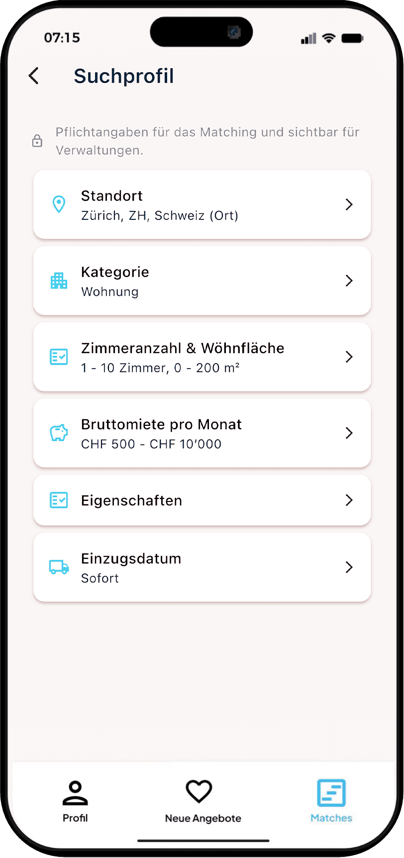Erfassung eines Matching-Profils bei HomeMatch