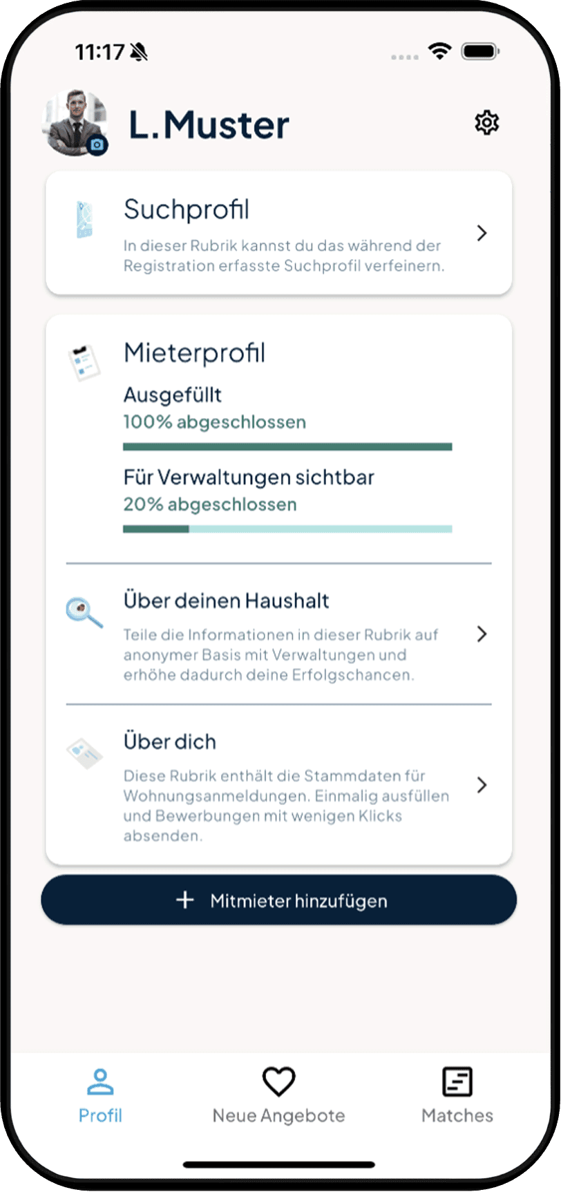 Dein Matching-Profil enthält neben den Suchkriterien ein anonymes Mieterprofil, mit dem du den Verwaltungen Auskunft über dich und deinen Haushalt geben kannst.