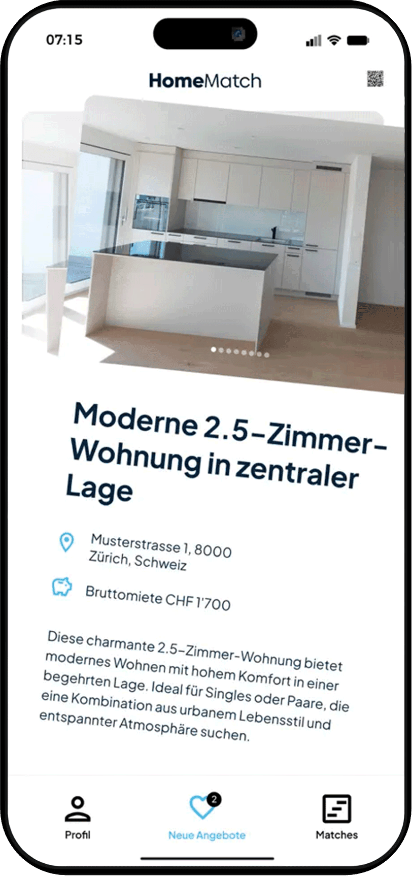 Mit HomeMatch beginnt im Schweizer Immobilienmarkt das Zeitalter der digitalen Matching-Plattformen. Wir ermöglichen dir eine schnelle und unkomplizierte Interaktion mit Immobilienverwaltungen. Dank innovativer Prozesse und modernster Technologie findest du mit HomeMatch bequem und zeitsparend ein neues Zuhause.