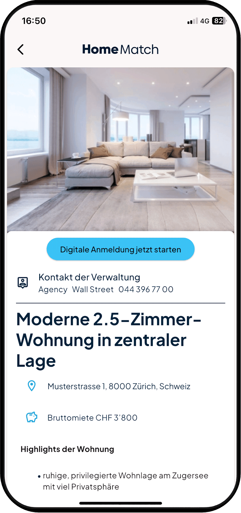 Die Prüfung von Wohnungsinseraten, die Vereinbarung von Besichtigungsterminen und das Anmeldeverfahren erledigst du bequem per App.